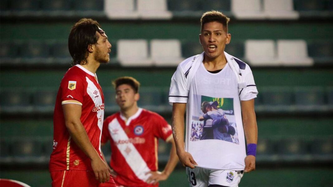 El delantero de Gimnasia se levantó la camiseta y debajo de la misma, lucía una camiseta blanca con la imagen de un abrazo suyo con Diego Maradona. La imagen del ex DT del Lobo emocionó a todos, recordando también que la primera victoria Tripera en la presente Copa Argentina que ya terminó, fue con Maradona sentado en el banco de los suplentes.