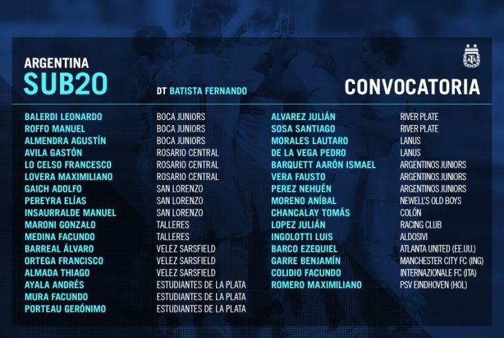 En la delegación se destacan varios juveniles que están jugando en el fútbol europeo como son los casos de Benjamín Garré (Manchester City), Facundo Colidio (Inter de Milán), Maximiliano Romero (PSV Endhoven) y Ezequiel Barco (Atlanta United).