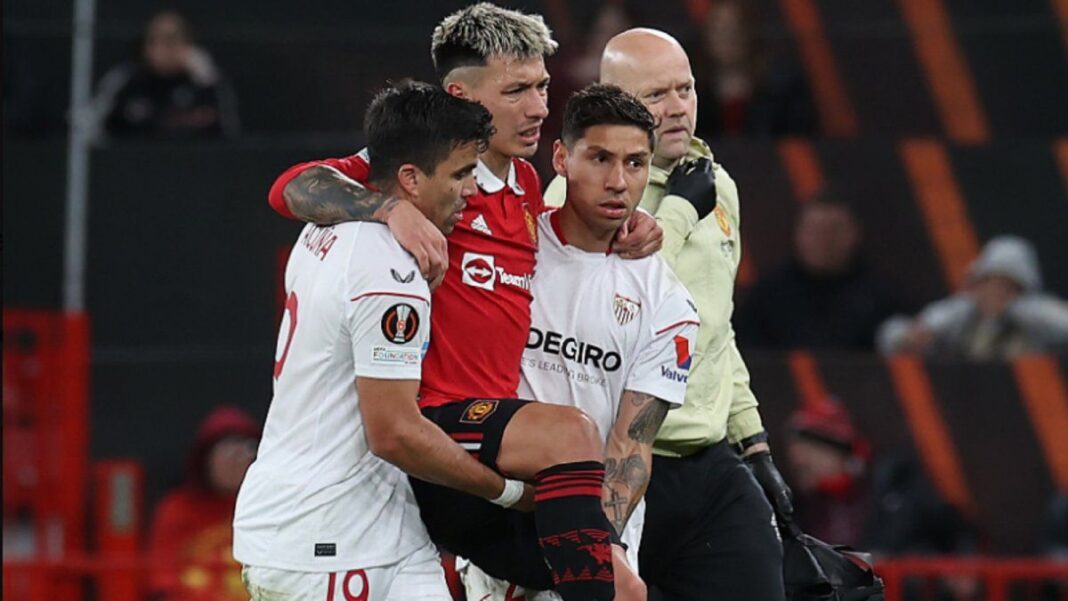 Lisandro Martínez se lesionó y entre Montiel y Acuña lo ayudaron a salir del campo de juego en el duelo entre Manchester United y Sevilla por la Europa League