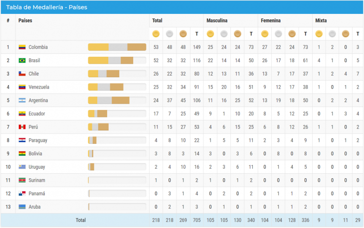 106 medallas lleva acumulado el país hasta el momento, siendo el tercer país que más sumó pero ubicándose quinto en el medallero al tener menos preseas doradas que Chile y Venezuela. De momento lleva 24 medallas de oro, 35 de plata y 42 de bronce.