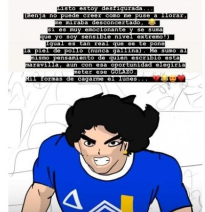 “Benja no puede creer cómo me puse a llorar, me miraba desconcertado”, escribió Giannina Maradona en su cuenta de Instagram. “Igual es tan real que se te pone la piel de pollo (nunca gallina)”, agregó, y puso un link a la cuenta de YouTube @L0nz0, que fue la que lo subió a las redes.