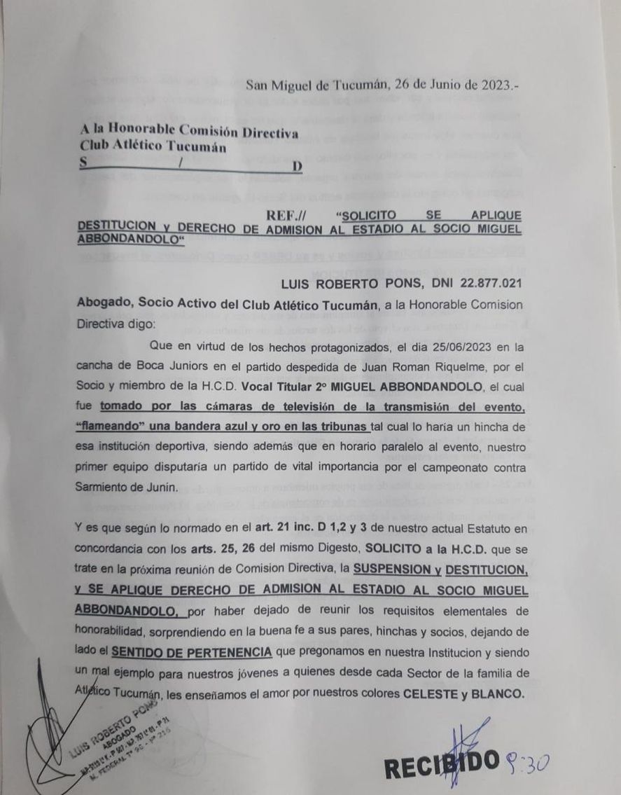 – La Comisión Directiva del Club Atlético Tucumán informa que en el día de la fecha el Sr. Miguel Abbondándolo presentó su renuncia al cargo de Vocal Titular de nuestra institución.