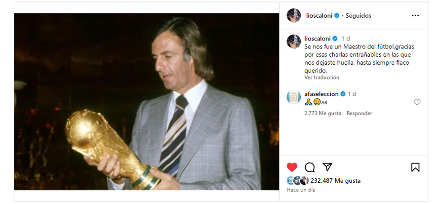 “Se nos fue un maestro del fútbol. Gracias por esas charlas entrañables en las que nos dejaste huella. Hasta siempre, Flaco querido“, escribió Scaloni en su cuenta oficial de la red social Instagram y que este mediodía llegó a la Argentina desde Mallorca para darle la despedida a quien “intimó” a Tapia a que le ofrezca al santafecino un contrato acorde a un entrenador de una selección de elite mundial.