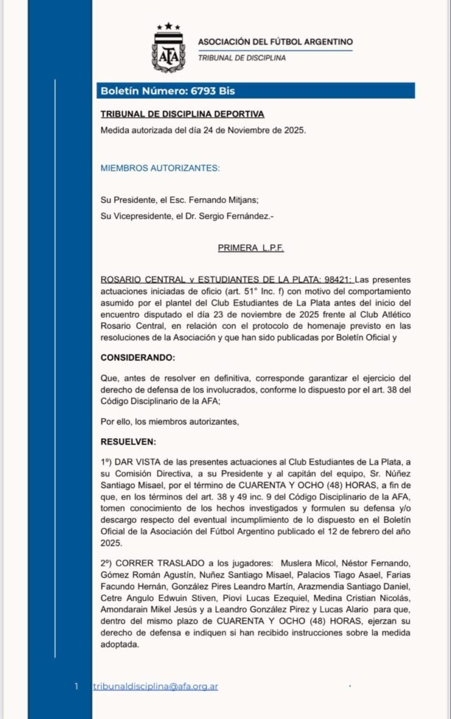 Y esto no quedó acá, claro. La movida de Estudiantes de hacer el pasillo de espalda revolucionó a todo el fútbol argentino y le hizo una declaración de guerra explícita a la AFA. Y el día después, la que salió a la carga fue justamente la entidad de Viamonte a través de su Tribunal de Disciplina. ¿Y qué pasó? En una medida inédita, citó a todos los jugadores que participaron del hecho a declarar y hacer su descargo dentro del plazo de 48 horas.