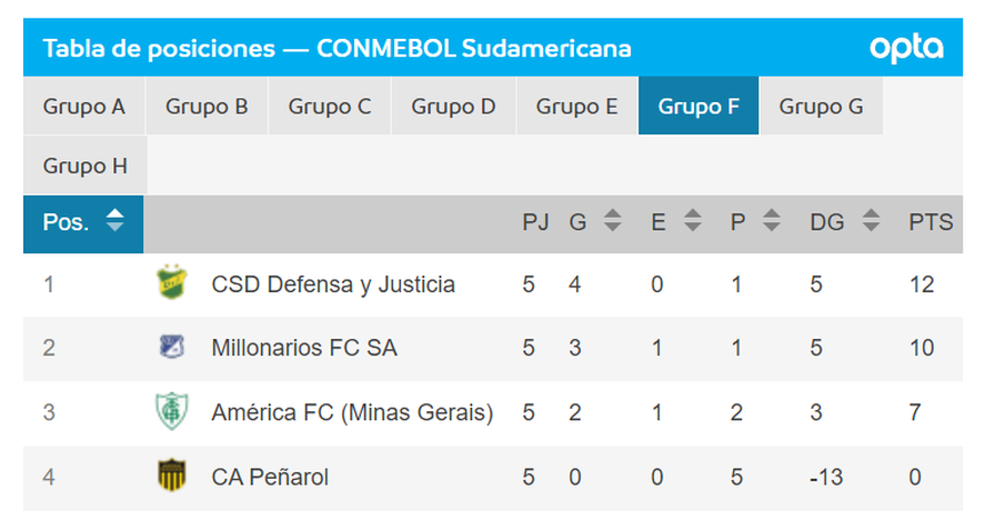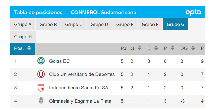 Con la victoria de Santa Fe ante la U quedaron ambos con siete puntos mientras que el Lobo, en el último lugar, suma cuatro. A tres puntos de ambos, podría igualarlos en la sexta jornada en caso de ganar en Perú y de que Goiás triunfe ante los colombianos.