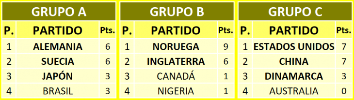Los dos primeros de cada zona avanzaron a Cuartos de Final al igual que los dos mejores terceros. Brasil, el único país sudamericano que dijo presente, se despidió en la Fase de Grupos al quedar último en el Grupo A, que compartió junto a Alemania, Suecia y Japón.