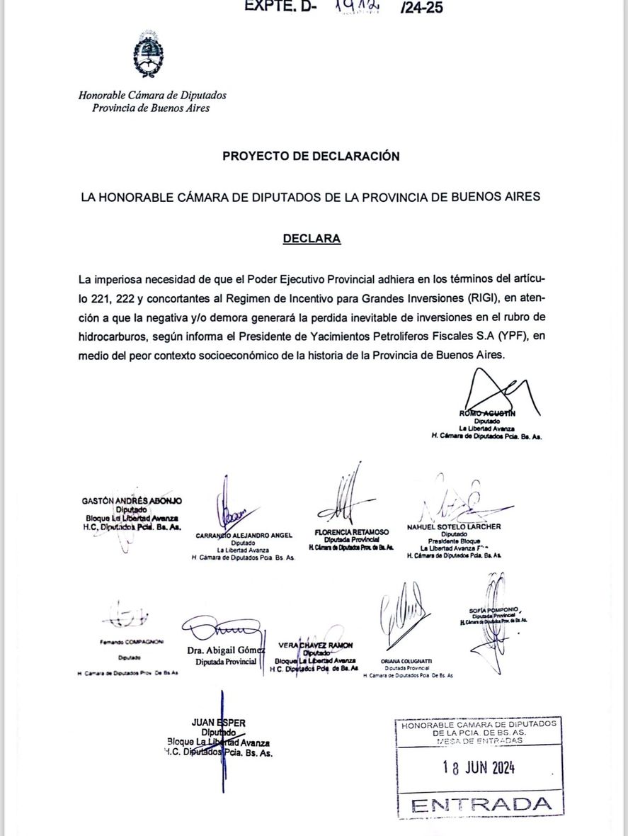 El proyecto fue presentado por el diputado Agustín Romo, bajo el mismo pretexto que el titular de YPF apretó a la Provincia para que adhiera al régimen, que el Gobernador calificó de “desastre”. “La negativa y/o demora generará la perdida inevitable de inversiones en el rubro de hidrocarburos tal cual lo expresó el Presidente de YPF. En medio del peor contexto socioeconómico de la historia de la provincia de Buenos Aires, generar trabajo es fundamental para bajar la pobreza”, aseguró Romo.