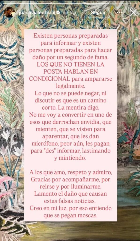 En medio del revuelo, Juana Viale decidió romper el silencio y publicó un extenso comunicado en sus redes sociales. Allí cuestionó duramente la difusión de versiones sin sustento y apuntó contra quienes, según expresó, priorizan el impacto mediático por sobre la verdad.