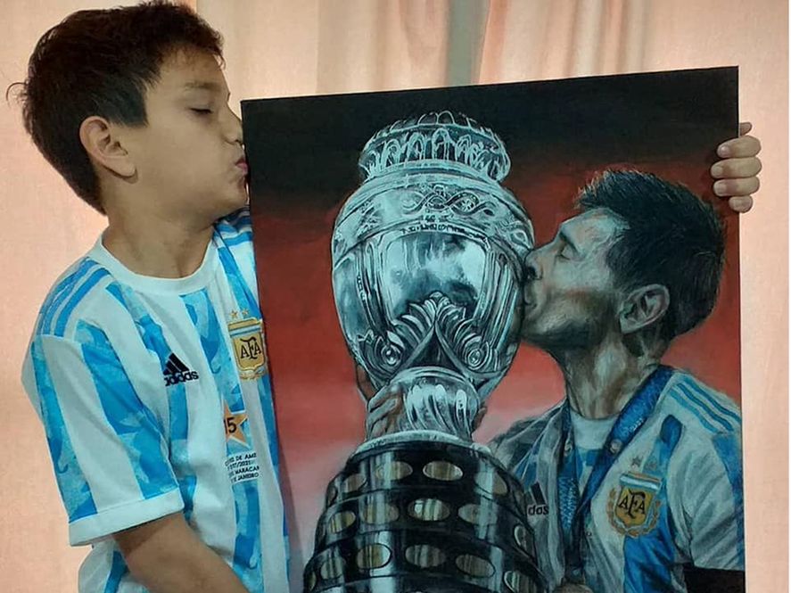Entre las obras que realiza, hay una cara que se repite más que otras y es la de uno de sus héroes sin capa: Lionel Messi. “Estoy haciendo un proyecto con cuadros de Messi, que después los quiero subastar a beneficio”, anticipa y aclara: “El cuadro en el que está (Messi) besando la copa quiero regalárselo para que lo tenga en el living de su casa”.