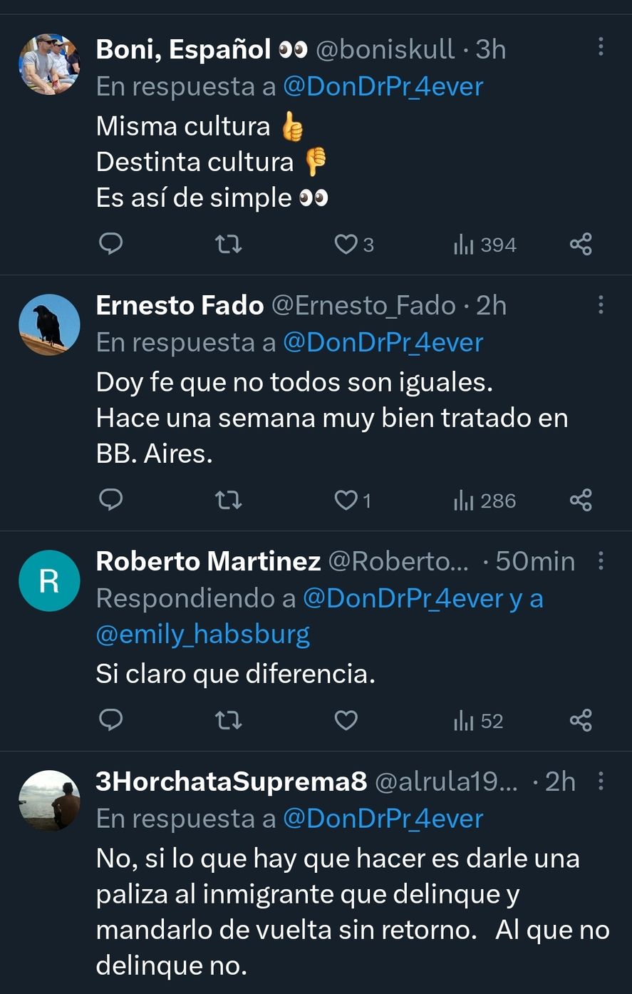 El debate online derivó además hacia un costado más sociológico cuando un usuario escribió: “La mayoría de inmigrantes q recibe España no vienen con salarios de 6.000€/mes… Vienen con un bajo nivel de estudios y a la aventura… Si la cosa va bien y tienen para comer.. genial… pero ¿y si la cosa no va bien? ¿Y si no tienen un ingreso estable? ¿Q crees q van a hacer?“.
