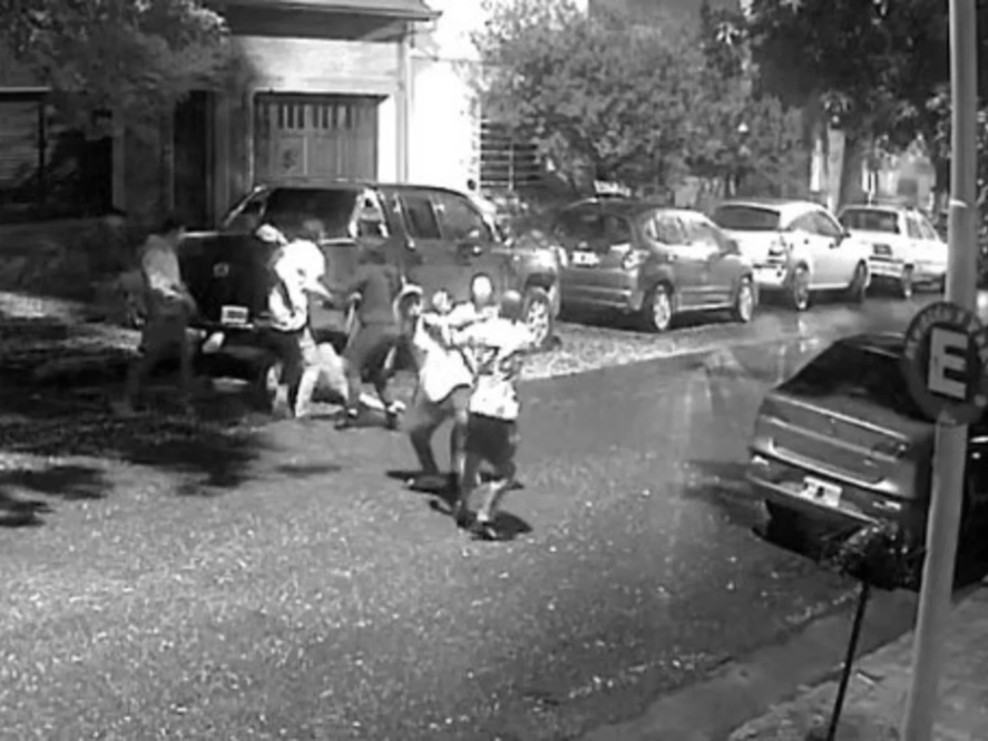 Se trata de un video de una cámara de seguridad que se viralizó en las últimas horas y en el que se observa la pelea de varios jóvenes en la calle Fitz Roy al 400, donde uno de ellos recibió patadas y golpes de puño hasta que cayó al piso.