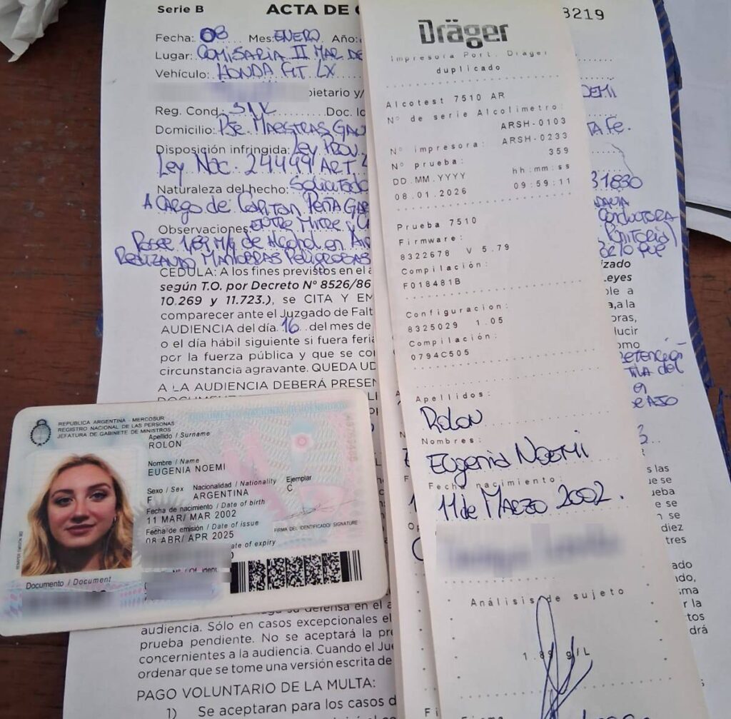 Personal policial de la provincia de Buenos Aires que realizaba tareas en el Operativo Sol junto con agentes municipales de tránsito secuestraron el automóvil Honda FIT y practicaron un test de alcoholemia a la joven de 23 años, que arrojó “un resultado positivo con 1,89 mgrls”, consigna el informe policial.