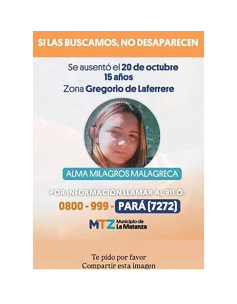 La familia de Alma Milagros Malagreca, una adolescente de 15 años de Laferrere, partido de La Matanza, vive horas de angustia. La joven fue vista por última vez el lunes pasado, al salir del colegio al mediodía, y desde entonces nada se sabe de su paradero. Pasaron más de 72 horas y la preocupación crece con el correr del tiempo.