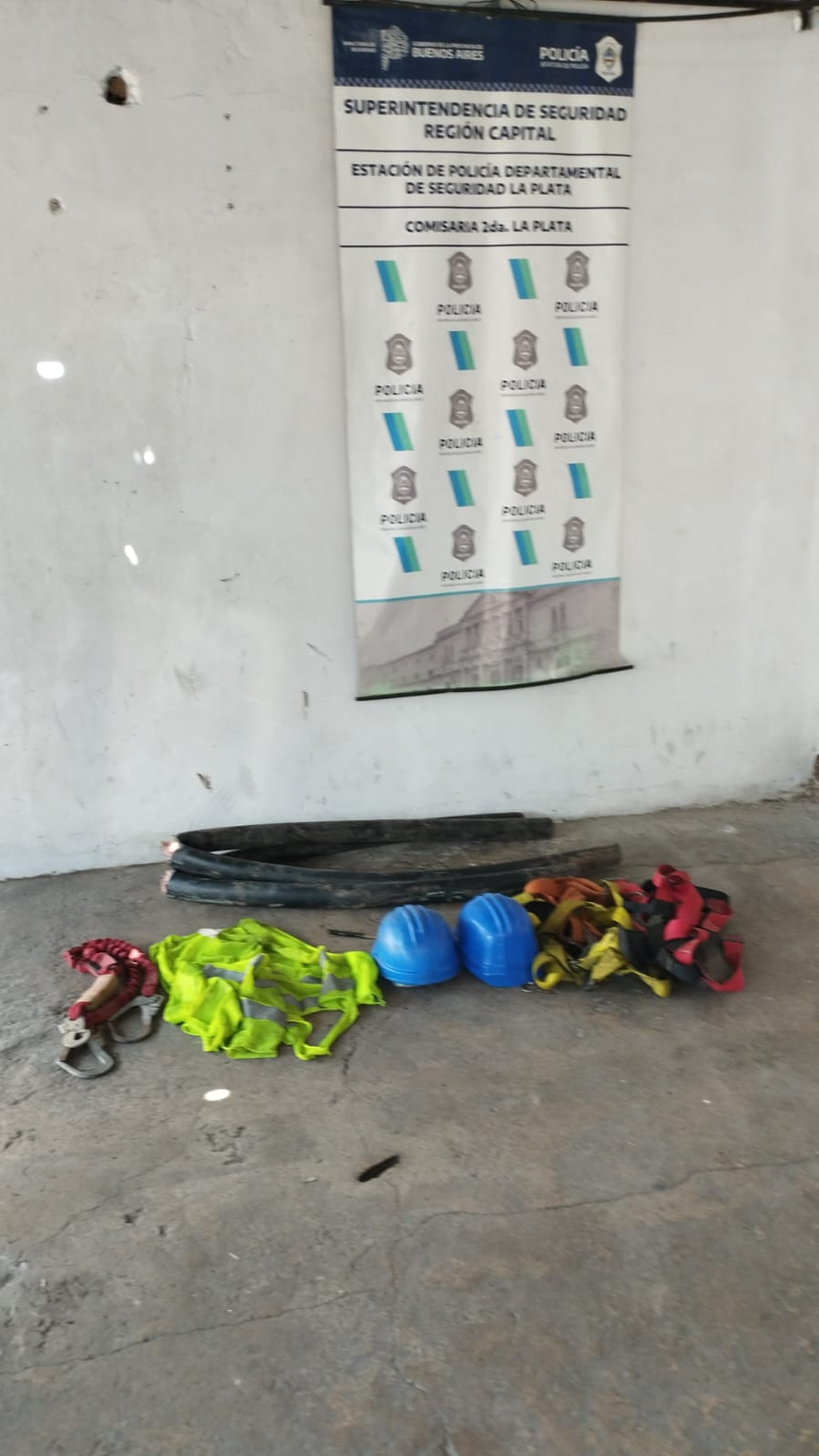 Además de las personas que fueron derivadas a la Comisaría 2da de La Plata se les secuestró una camioneta color negra marca Fiat, un cuchillo del tipo serrucho, dos teléfonos celulares, tres arneses, dos cascos, chalecos reflectivos y dos extensiones de cables.