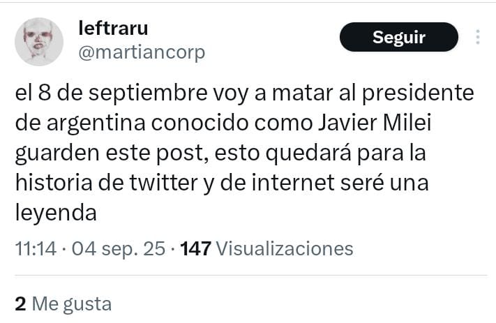 La investigación había comenzado a principios de septiembre, cuando la División Seguridad Presidencial de la PFA detectó un mensaje publicado por un usuario que operaba bajo el seudónimo Martiancorp. En aquella publicación, difundida en una reconocida red social, el perfil escribió: “El 8 de septiembre voy a matar al presidente de Argentina conocido como Javier Milei. Guarden este post, esto quedará para la historia de Twitter y de internet. Seré una leyenda”. La gravedad del texto activó inmediatamente los protocolos internos de la fuerza.