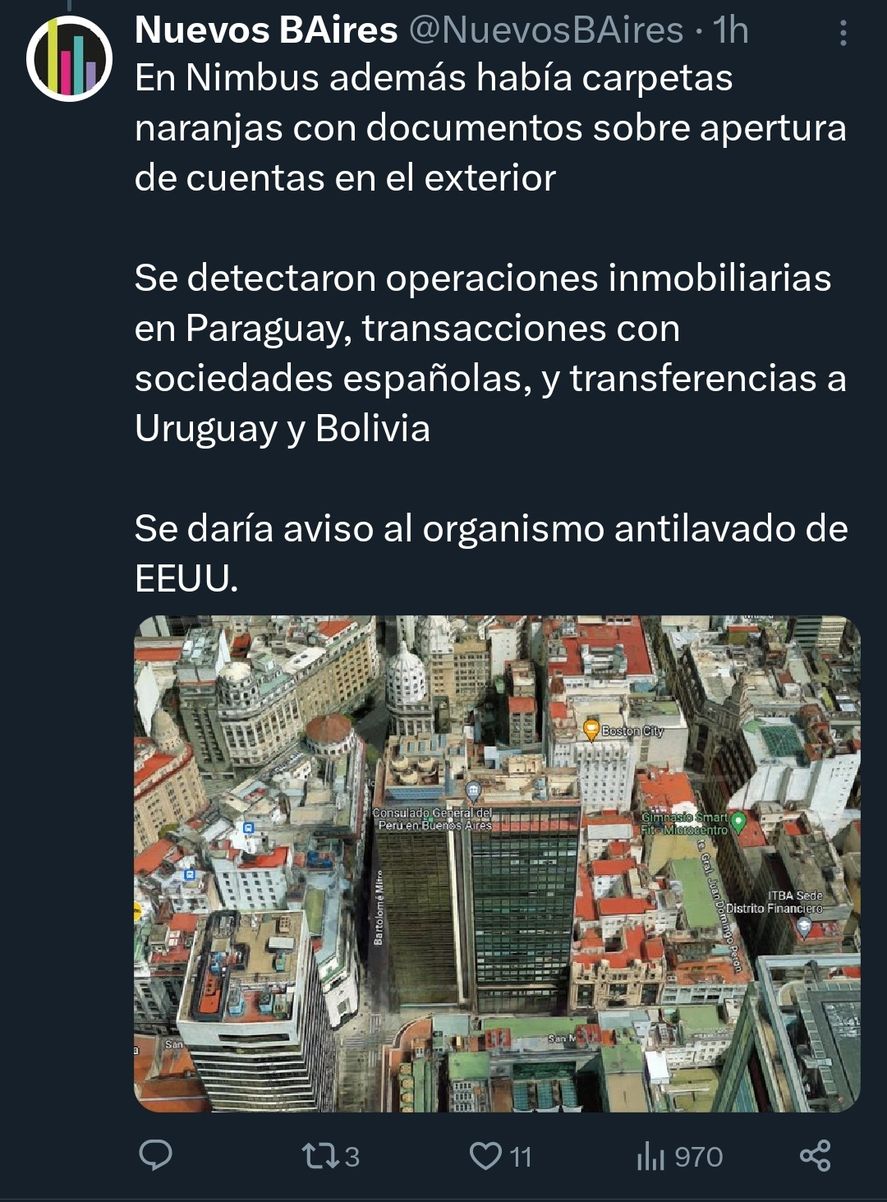 En las oficinas de Nimbus, ubicadas en la calle San Martín 140, piso 19, se incautaron más de 100 mil dólares y documentación valiosa para la investigación. Según fuentes judiciales, Rojnica tenía cuentas offshore en Estados Unidos, operaciones inmobiliarias en Paraguay y sociedades en España. También se lo vincula con otros cueveros que operan en la calle Sarmiento.