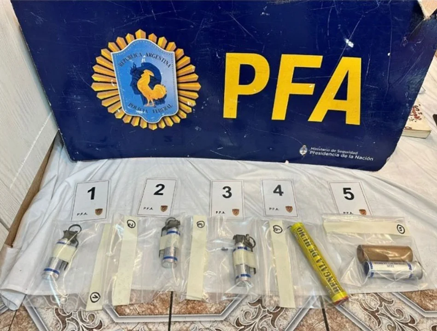 Entre lo hallado había armas, municiones y explosivos, entre ellas una pistola calibre 22 con balas, 6 cartuchos de escopeta, 3 granadas de gas de hostigamiento, una bengala de humo, varias armas de aire comprimido, katanas, otras armas blancas de distintos tamaños y una faca.