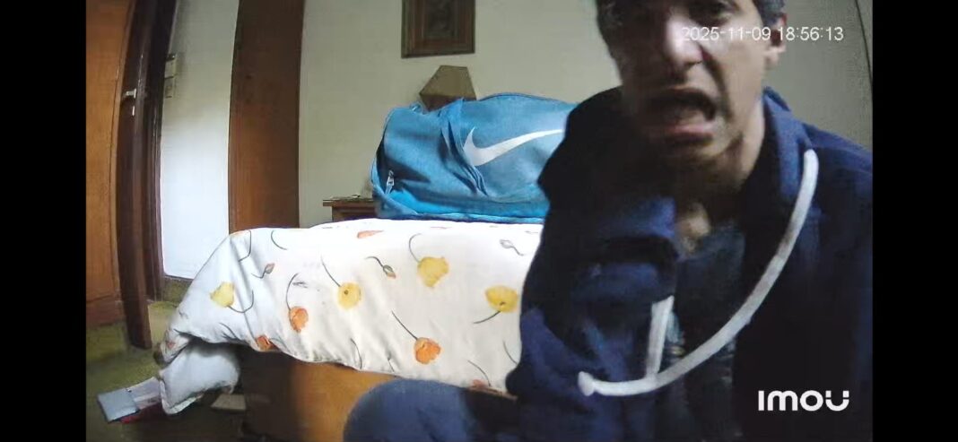 En las imágenes se lo ve ingresar con un bolso azul, recorrer los ambientes y dirigirse directamente al dormitorio, donde revisó cajones y armarios, tomando dinero y objetos personales. En un momento, el rostro del delincuente quedó grabado en primer plano, hasta que notó la presencia de la cámara y giró el lente para taparla.