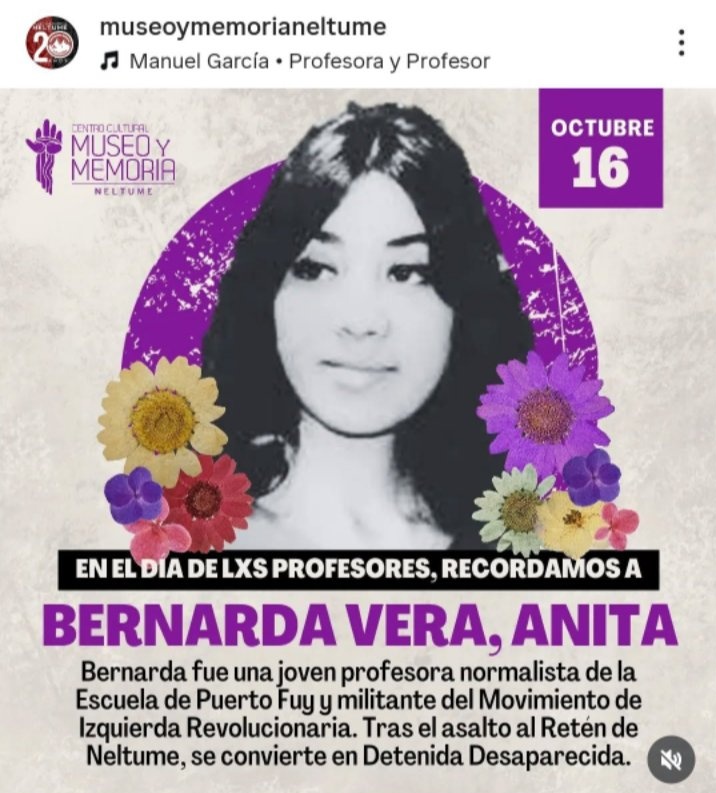 Bernarda Vera tenía 27 años y una hija de 5 cuando fue detenida por militares el 10 de octubre de 1973. Según los registros oficiales, habría sido ejecutada en el puente de Villarrica, sobre el río Toltén, en la región de la Araucanía. Militaba en el Movimiento de Izquierda Revolucionaria (MIR) y estaba incluida en la lista de 1.162 desaparecidos que documentó el Informe Rettig, equivalente chileno de la CONADEP argentina.