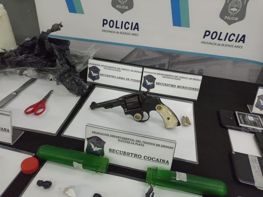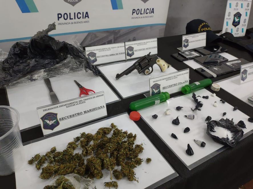 En los registros los policías incautaron 22 envoltorios con cocaína, una bolsa con cogollos de marihuana, elementos de cortes, dos balanzas de precisión y un arma de fuego, un revólver calibre 32, además de dinero y tres teléfonos móviles.