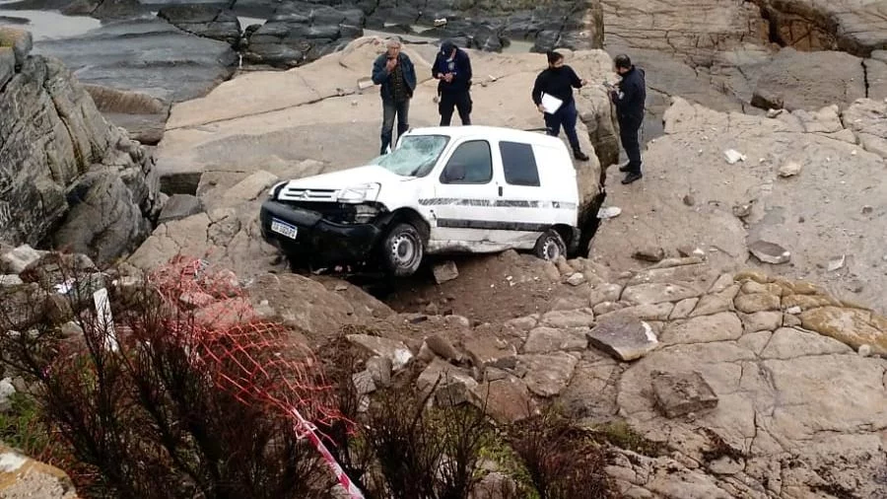Esta vez el vehículo involucrado fue una camioneta Citroen Berlingo, que se despistó, cruzó el muro de protección y cayó varios metros abajo para caer sobre el sector de piedras, a no más de dos metros de donde golpean las olas del mar.