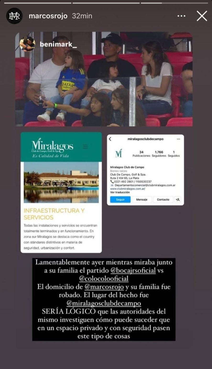 El defensor de 31 años confirmó la noticia en sus redes sociales luego de compartir un posteo del usuario de Instagram Benimark_ que dio algunos detalles del hecho delictivo: “Lamentablemente ayer mientras miraba junto a su familia el partido Boca Juniors vs. Colo Colo, el domicilio de Marcos Rojo y su familia fue robado”. El ex Manchester United reside actualmente en Miralagos Club de Campo, Golf & Spa, ubicado en el kilómetro 67 de la Ruta 2 en una zona cercana a Coronel Brandsen y a Olmos.