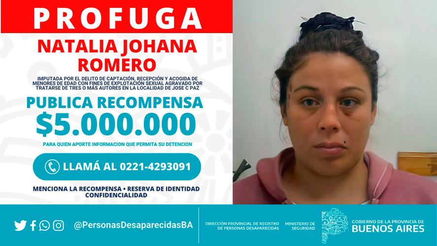 Allí menciona que Romero es buscada en todo el país por el delito de “captación, recepción y acogida de menores de edad con fines de explotación sexual agravado por tratarse de tres o más autores”.