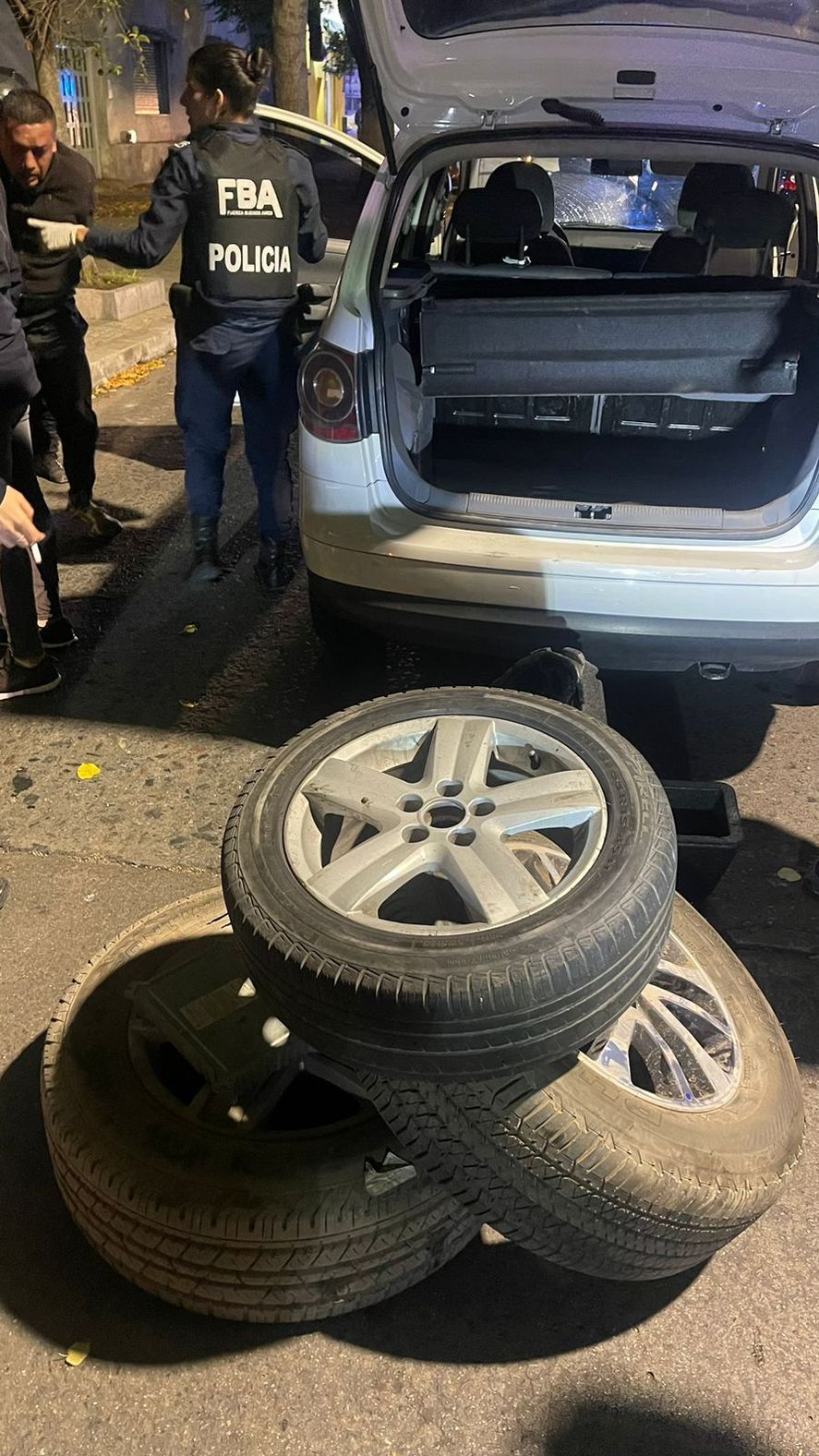 En el auto los policías incautaron una llave cruz y tres ruedas completas, además de una llave presión y un alicate corta cadenas.