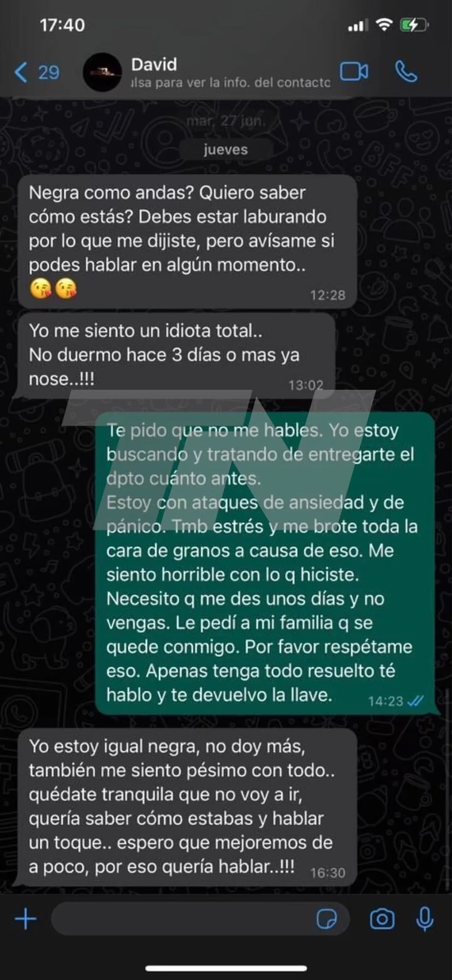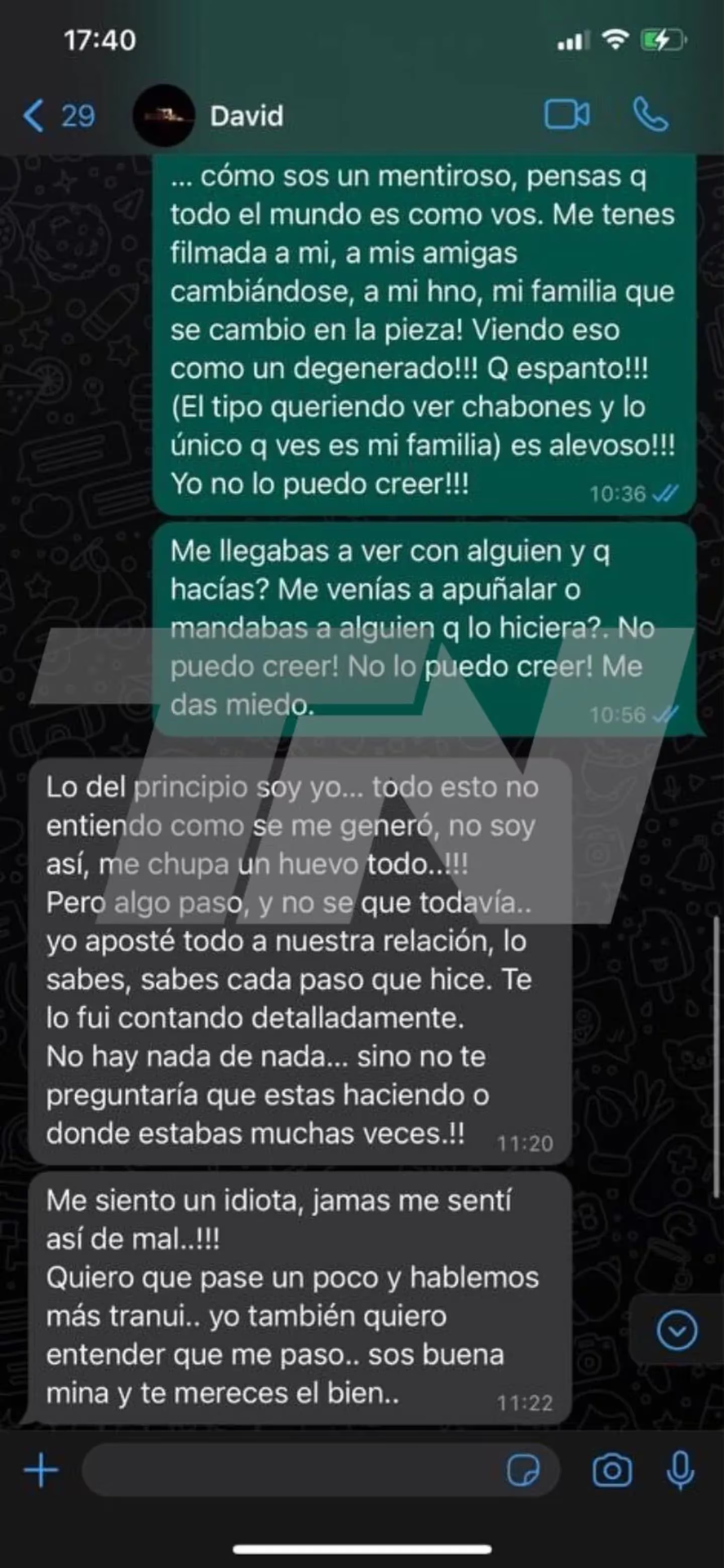 Poco después, el sitio TN publicó una serie de fuertes chats entre Araceli y Nalbandian en los que ella le reprocha su decisión de espiarla y le pide que no le hable, que está acompañada por su familia, y que en breve le devolverá el departamento.