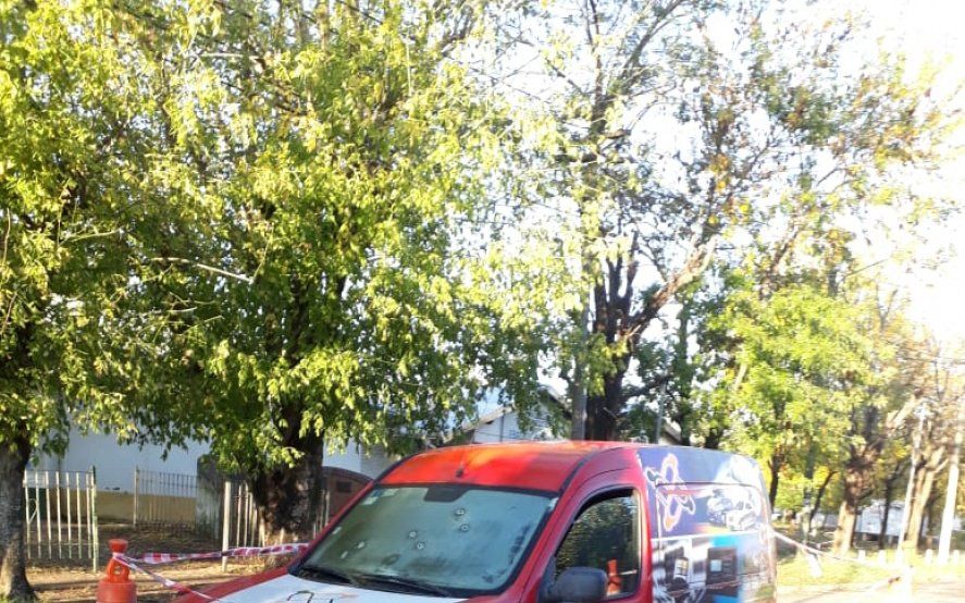 La camioneta Kangoo roja de la empresa “Protección Total” que robaron en el country fue hallada abandonada, con seis orificios de bala en el parabrisas, en el cruce de las calles 152 y 54, a unos 900 metros del country.