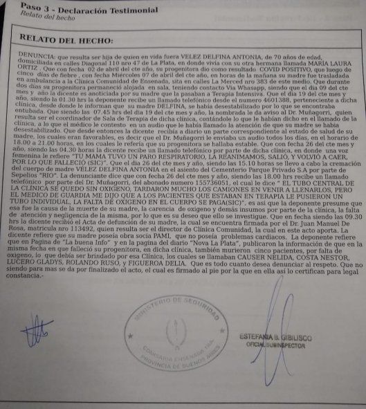 Pasados dos días mas, le informan a la familia que Delfina sería “entubada”, le suministrarían más oxígeno: “Nosotros le dijimos al médico, él no sabía nada. De hecho nos dice que le llamaba la atención y que iba a ir a ver, porque mi mamá estaba bien el día anterior”, agregó Carla.