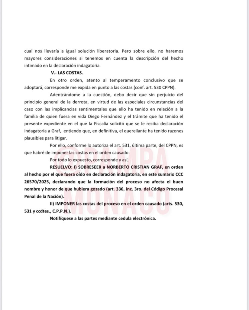 Finalmente, el juez concluyó que no existían pruebas para sostener la acusación de encubrimiento ni ningún otro delito, motivo por el cual dictó el sobreseimiento total. La resolución fue cargada en el expediente el viernes a las 22:30 y se conoció recién públicamente en las primeras horas de este lunes.