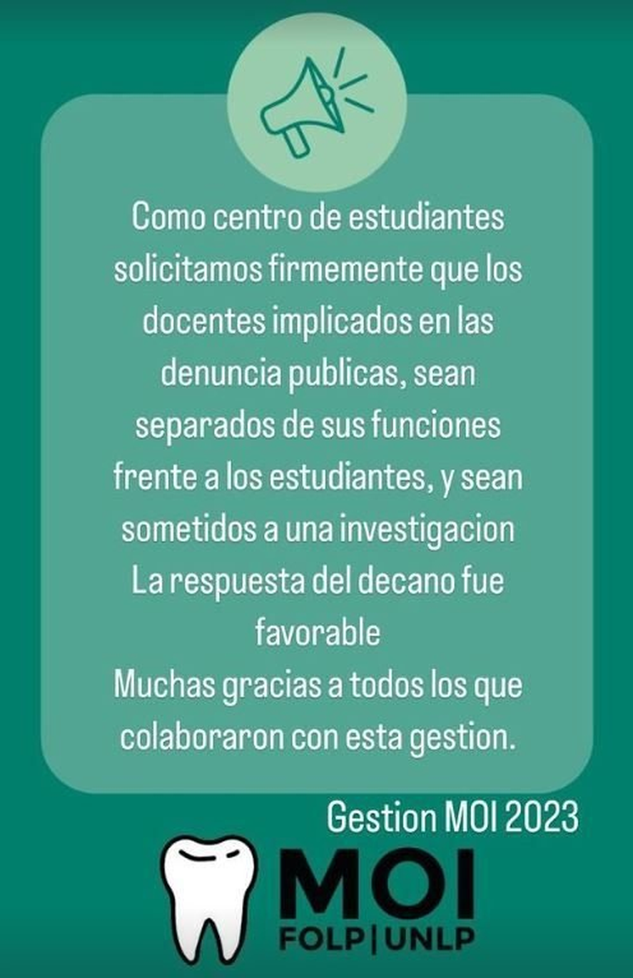 La actual conducción del centro de estudiantes de la Facultad de Odontología de la UNLP emitió un comunicado luego de que este fin de semana trascendieran los abusos que sufrieron dos mujeres por parte de dos docentes, uno de los cuales fue denunciado ante la Justicia.