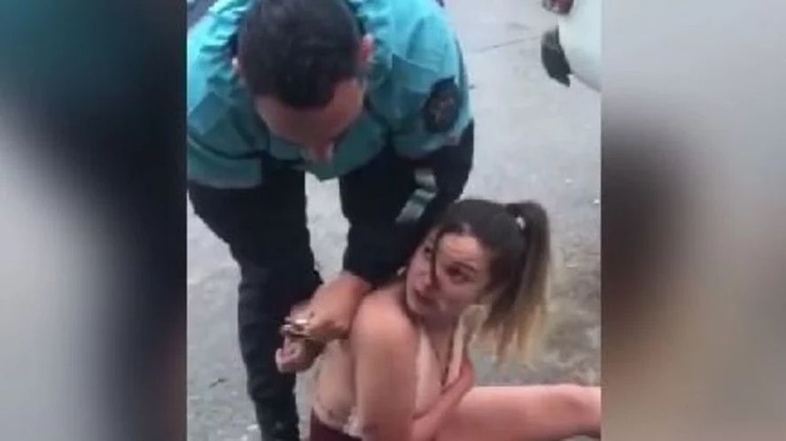 La secuencia quedó captada en el teléfono celular de una de las testigos que grabó el procedimiento de los efectivos policiales. Por la brutal respuesta, la joven terminó con moretones y dolores alrededor de sus muñecas.