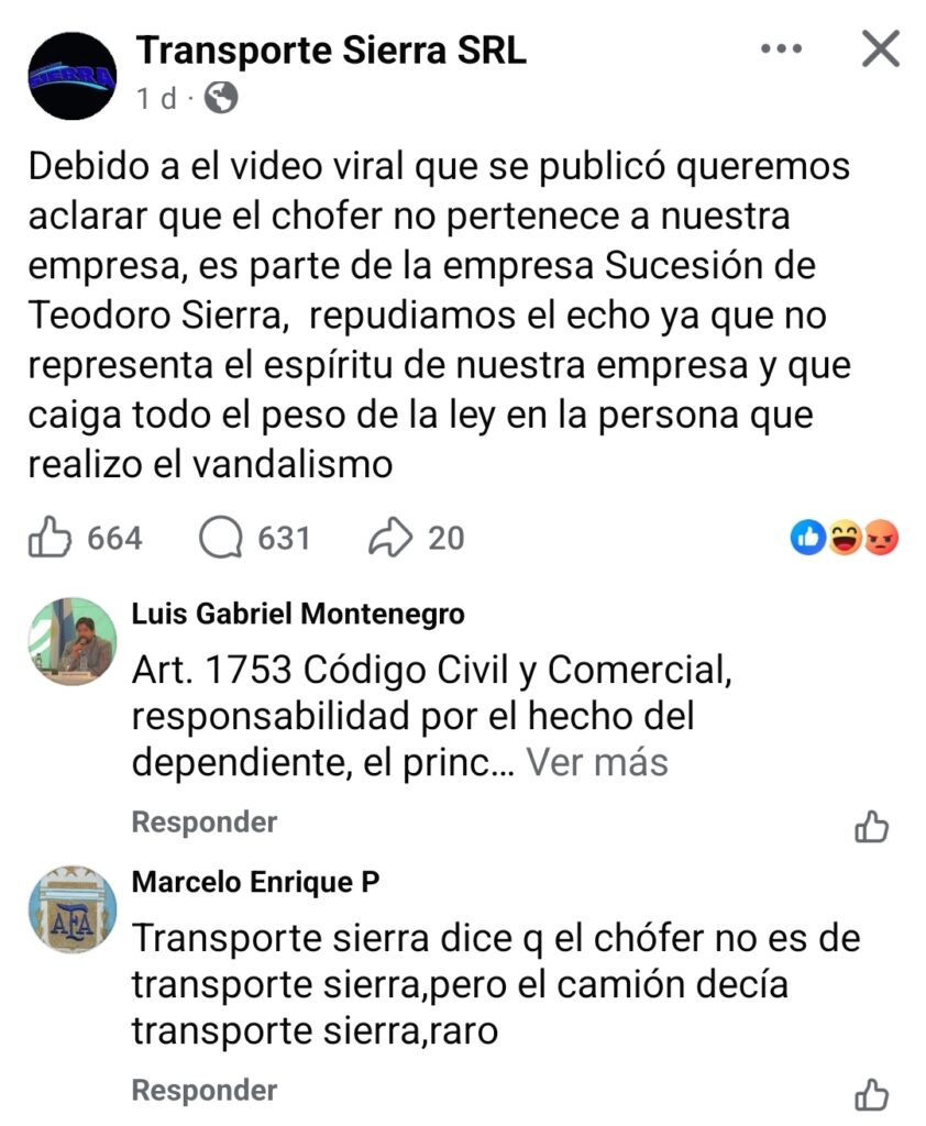 A través de sus redes sociales, Transporte Sierra se despegó del hecho y aclaró que el chofer filmado no pertenece a su plantel. El mensaje fue difundido de manera textual y reproducido por distintos medios: