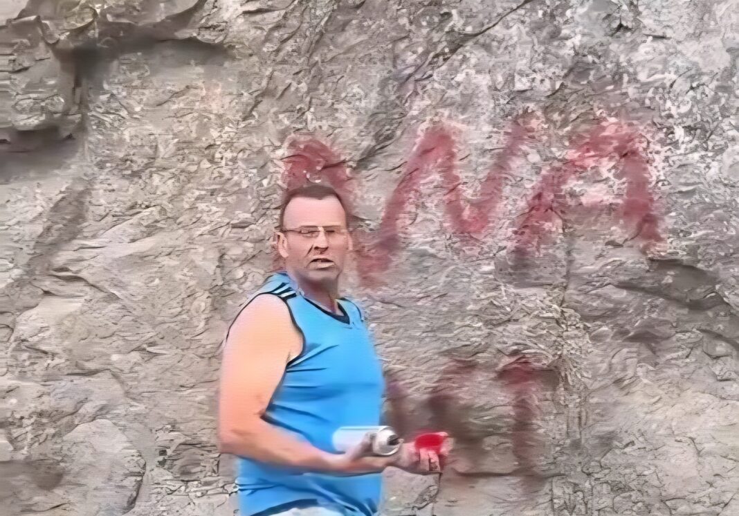 Las imágenes muestran al conductor de un camión detenido al costado del camino, pintando con aerosol una roca que forma parte del paisaje protegido. No se trata de una estructura urbana ni de un paredón abandonado, sino de una formación natural ubicada dentro de un área donde cualquier tipo de intervención humana está expresamente prohibida.