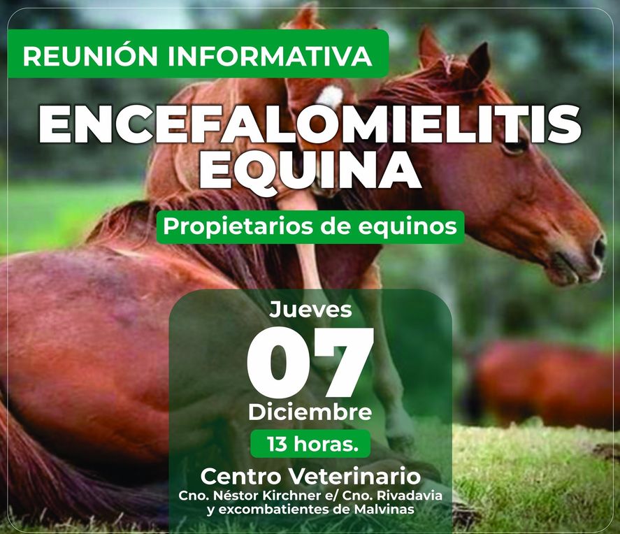 Este jueves 7 de diciembre, se realizará una reunión informativa destinada principalmente a propietarios de equinos, sobre Encefalomielitis Equina, el virus que ataca a los caballos y también infecta a los seres humanos. La jornada se desarrollará a partir de las 13 horas en el edificio del Centro Veterinario Municipal ubicado en Camino Néstor Kirchner y Ex Combatientes de Malvinas, en la ciudad de Ensenada.