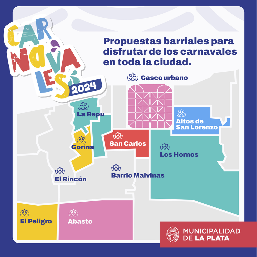 El carnaval familiar de San Carlos se realizará en 131 y 33 con la presencia de comparsas, murgas, grupos musicales y patio de comidas, y en Barrio Malvinas habrá corso apto para todo público en 149 y 35.