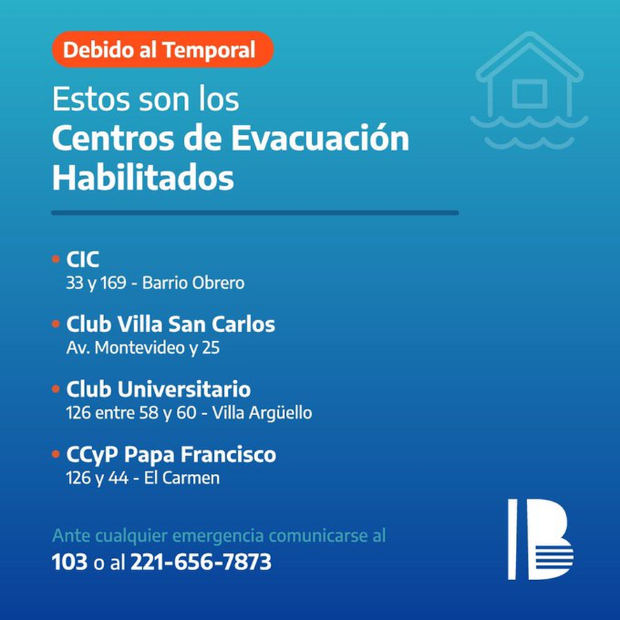 Ante la complejidad de la situación la comuna habilitó cuatro centros de evacuados: el Centro Integrador Comunitario de Barrio Obrero (calle 33 y 169); el Club Villa San Carlos (Av. Montevideo y 25); el Club Universitario (126 entre 58 y 60 – Villa Argüello) y el CCYP Papa Francisco (126 y 44 – El Carmen).