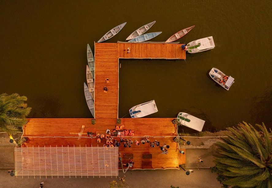 El muelle ubicado en el predio se remodeló creando un sector de descanso y mirador, y a su vez se construyó un muelle flotante construido con paneles de polietileno.