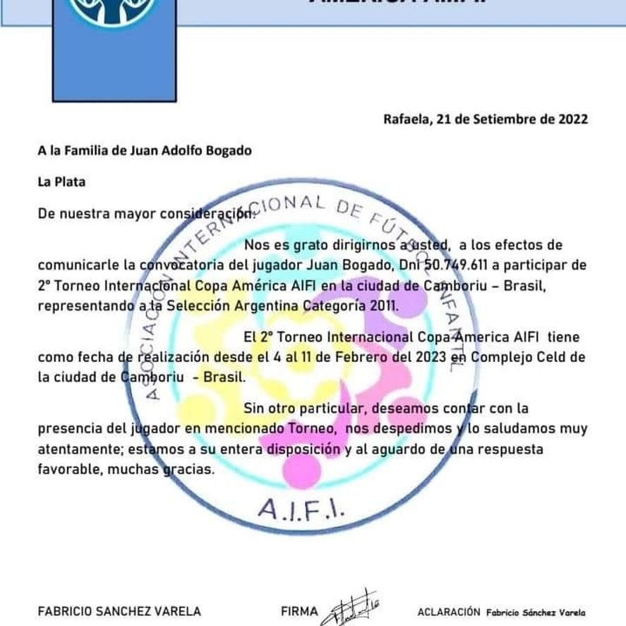 A Juan Adolfo Bogado, un niño de 11 años que vive en La Plata, le llegó la convocatoria para ser parte de la Copa Americana, organizada por la Asociación Internacional de Fútbol Infantil (A.I.F.I.), que se jugará en febrero, en Camboriú (Brasil). Como la familia no puede pagar ese viaje, su mamá, Vanesa Bogado, decidió iniciar una colecta apelando a la solidaridad de 10 mil personas, que puedan colaborar con 30 pesos.