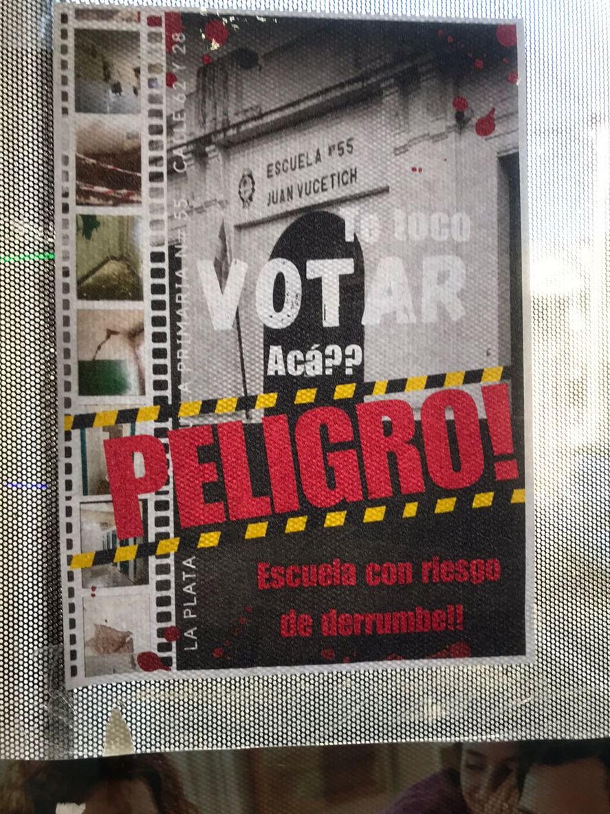 Al mismo tiempo, un kiosco cercano a la escuela se encarga de informar del peligro que corren los votantes mediante otro cartel: “¿Te toca votar acá? Peligro. Escuela con riesgo de derrumbe”.