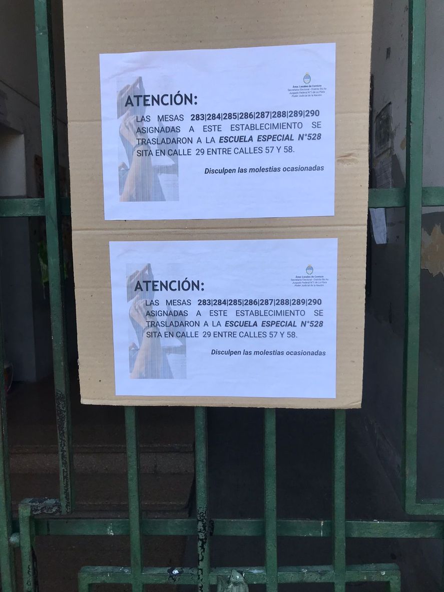 De esta manera, las personas asignadas para votar en la escuela ubicada en 62 y 28, se sorprendieron con un cartel que expresaba: “Atención: las mesas 283, 284, 285, 286, 287, 288, 289, 290 asignadas a este establecimiento se trasladaron a la Escuela Especial N°528 en calle 29 entre calles 57 y 58”.