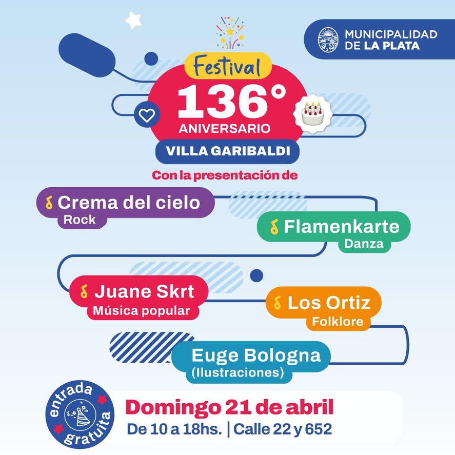 Villa Garibaldi celebra su 136° aniversario y para celebrarlo con los vecinos se prepara una jornada llena de actividades para festejar y disfrutar en familia el próximo domingo 21 de abril en calle 22 y 652. La jornada de festejo se desarrollará desde las 10 de la mañana hasta las 18:00 horas. Todas sus propuestas artísticas del Festival se planificaron en conjunto entre la delegación comunal e instituciones locales y la comunidad de Ignacio Correas.