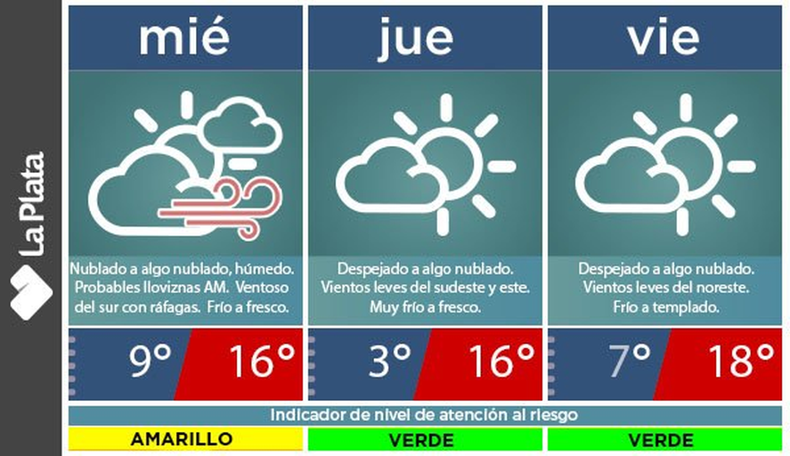Por su parte, la Dirección de Hidrometeorología de la Municipalidad de La Plata así pronosticó el clima: “Miércoles: nublado y húmedo a algo nublado. Probables lloviznas AM. Ventoso del sur con ráfagas. Frío a fresco. NAR AMRAILLO por vientos.Mín. 8°, Máx. 16°”