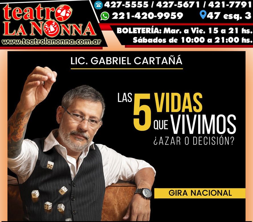 El licenciado Gabriel Cartañá se presentará este viernes 28 de junio en el Teatro “La Nonna“, y dará inicio a la función a las 21 horas. Un encuentro para entretenerse, reflexionar y pese a cualquier edad, responderse: cuál de tus cinco vidas estás viviendo.