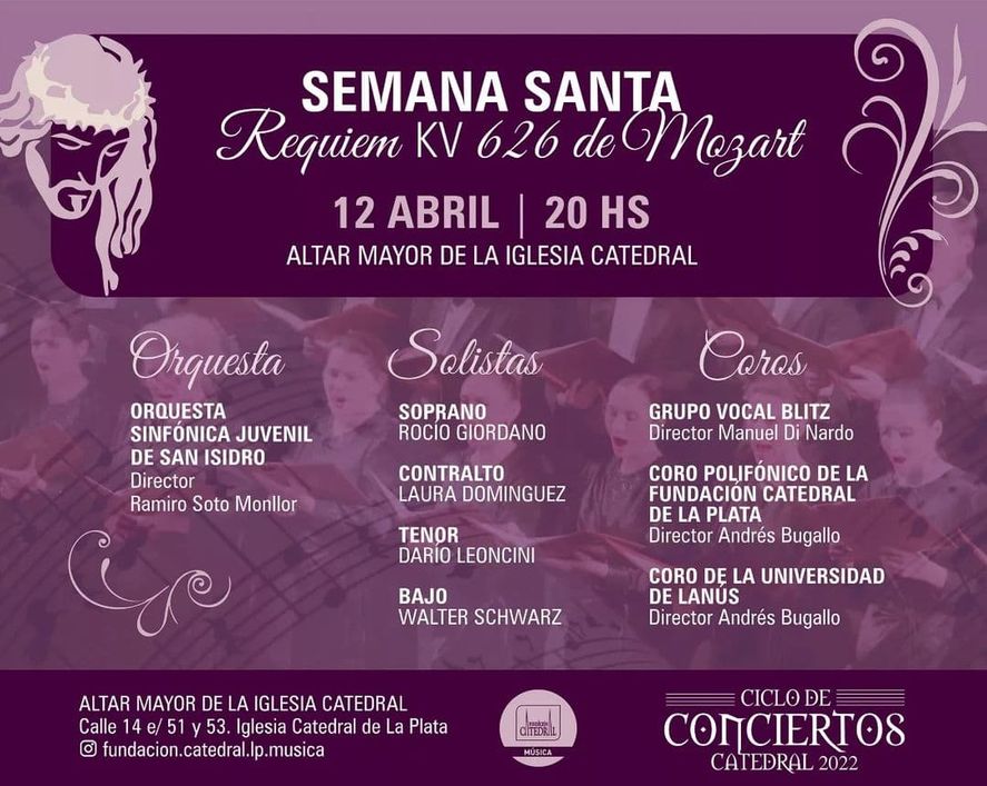 El martes 12 de abril a las 20.00hs, se presentará REQUIEM KV 626 W.A.Mozart de la mano de la Orquesta Sinfónica Juvenil de San Isidro, dirigida por Ramiro Soto Monllor, junto a los solistas soprano Rocío Giordano, contralto Laura Dominguez, tenor Darío Leoncini y bajo Walter Schwarz. Participarán también los coros Grupo Vocal Blitz (dirigido por Manuel Di Nardo), el Coro Polifónico de la Fundación Catedral de La Plata (dirigido por Andrés Bugallo) y el Coro de la Universidad de Lanús (dirigido también por Bugallo).