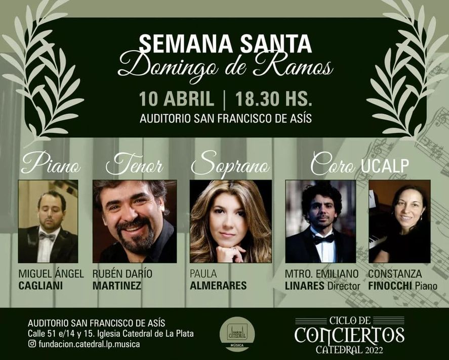 Paula Almerares y Rubén Darío Martinez inauguran la serie de Conciertos de Semana Santa, con Miguel Ángel Cagliani en piano y junto al Coro de la Universidad Católica de La Plata (UCALP), dirigido por el Emiliano Linares y acompañados al piano por Constanza Finocchi.