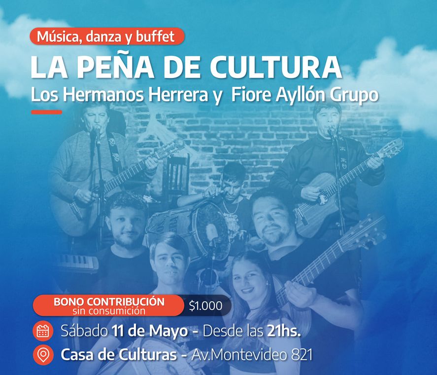Por otro lado, el sábado 11 de mayo llegará “La Peña de Cultura”, la cual abrirá sus puertas para recibir a los amantes del arte. También en esta oportunidad habrá shows contanto con la presentación de “Los hemanos Herrera“, las canciones de “Fiore Ayllon Grupo” y el baile y los movimientos que sumarán a la noche los profesores de la Casa de Culturas, lugar donde se realizará el encuentro tradicional.