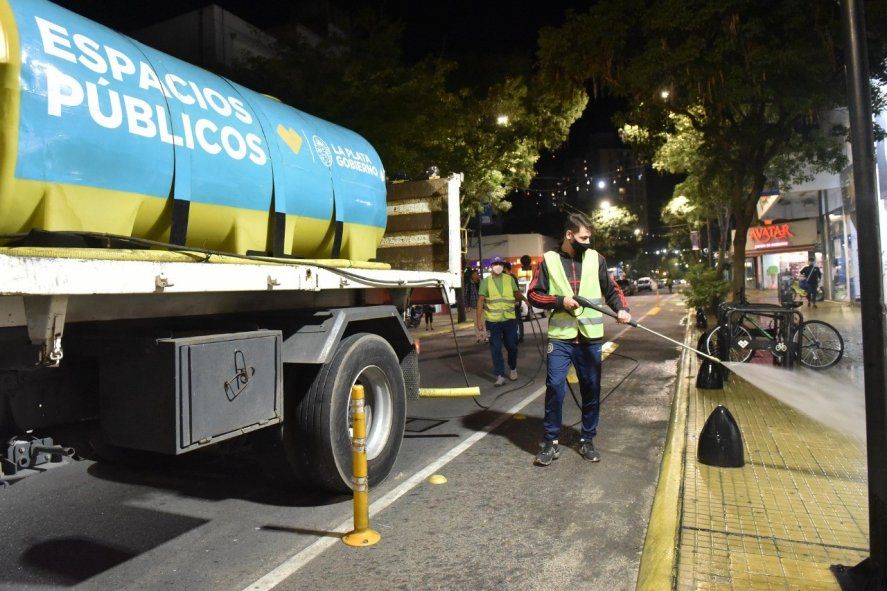 La Municipalidad de La Plata, continúa con los operativos de desinfección en espacios públicos. Como parte del plan de prevención local ante el avance del coronavirus, agentes realizan actividades de hidrolavado y desinfección de las veredas de los centros comerciales y gastronómicos de la ciudad.